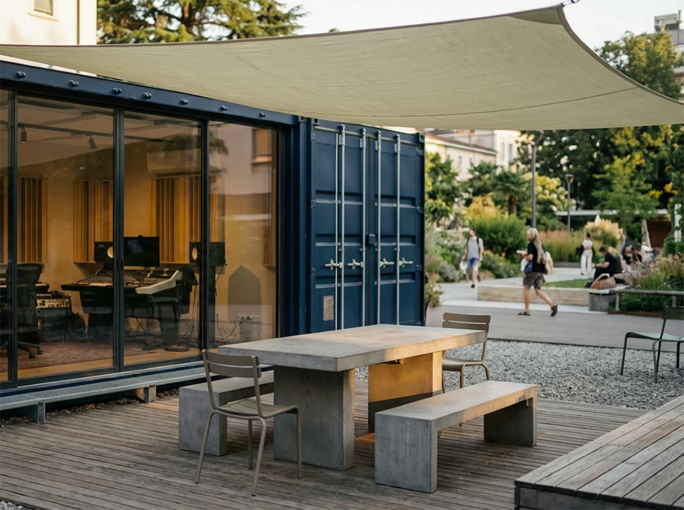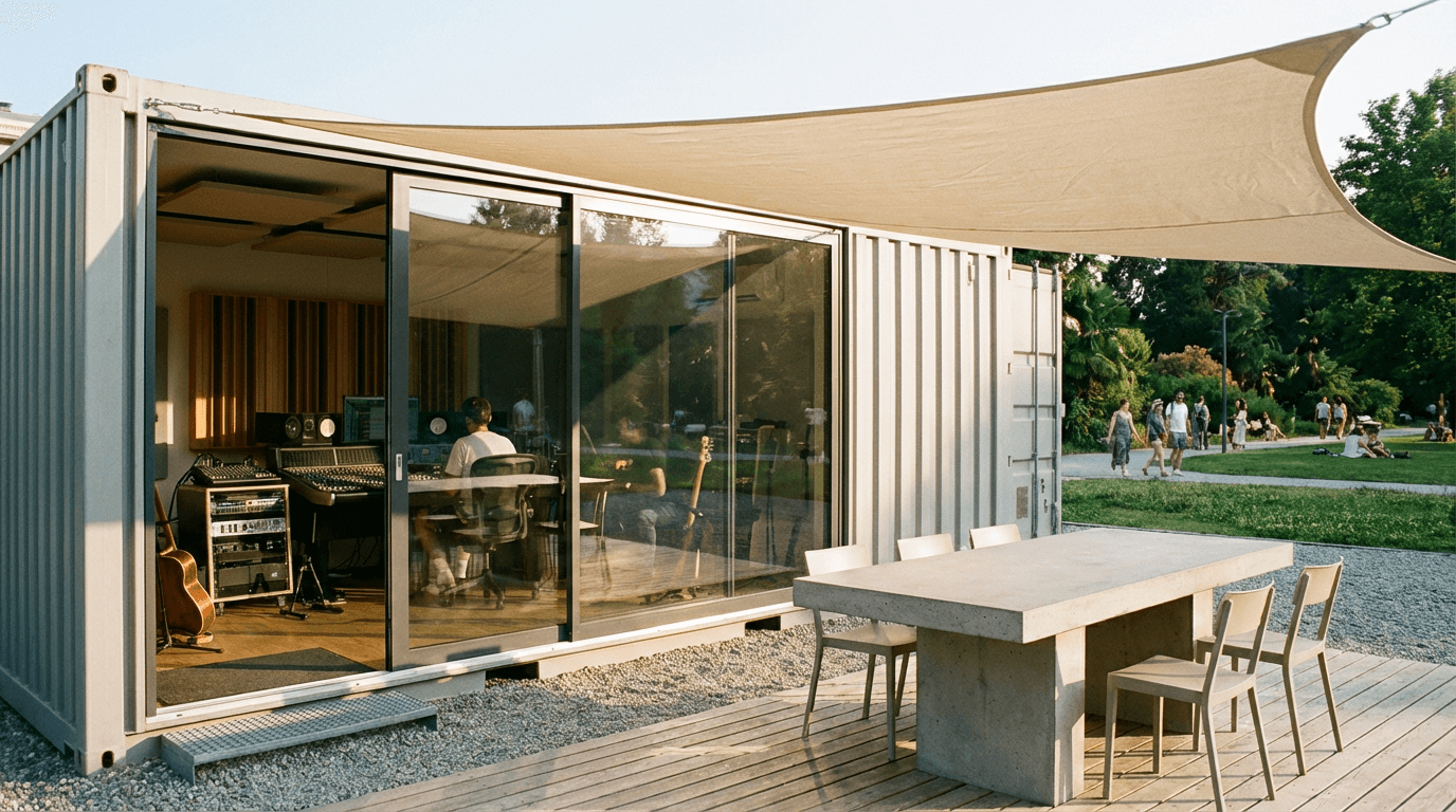 A container transformed into a music studio, bringing sound to public parks.